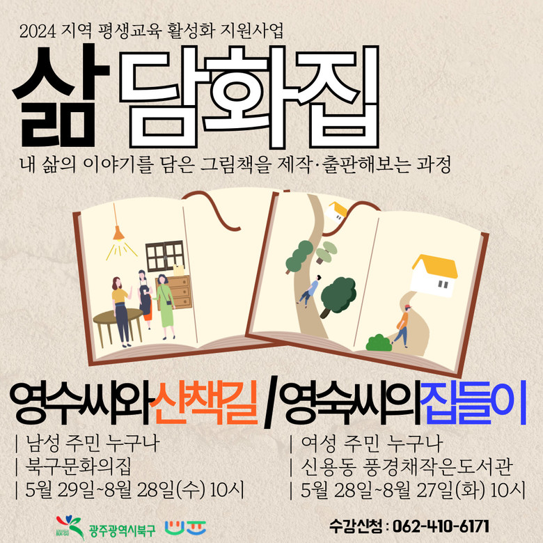 여성과 남성 과정이 각각 개설되는 이번 프로그램은 풍경채 작은도서관에서 여성 대상 ‘영숙씨의 집들이’ 과정이 북구문화의집에서는 남성 대상 ‘영수씨와 산책길’ 과정이 진행될 예정이다.