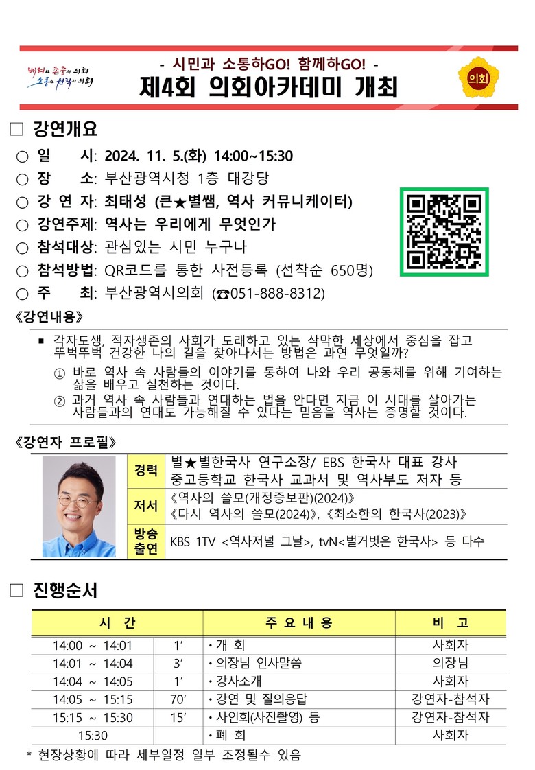 의회아카데미는 각 분야의 명사(名士)를 초청하여 부산시민과 함께하고 소통하기 위하여 마련된 강연으로서, 2023년부터 이어져 오고 있다. 이번 제4회 의회아카데미에서는 「역사의 쓸모」 저자이며 「벌거벗은 한국사」, 「역사저널 그날」등 TV 강연에 다수 출연하여 대중에게 친숙한 최태성 강사를 초청하여, ‘역사는 우리에게 무엇인가’라는 주제로 역사 속 사람들의 이야기를 통하여 나와 공동체를 위해 기여하는 삶을 배울 수 있는 자리가 펼쳐질 예정이다.