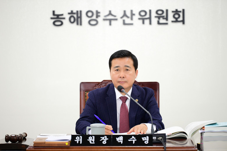 ▲ 백수명(국민의힘, 고성1) 농해양수산위원장은 “2024년 역대급 고수온 피해 발생 등 기후위기와 관련한 해양수산분야의 예산 편성이 무엇보다 중요하다”며 또한 “대규모 국책사업 추진 시 의회와 충분히 사전 소통하여 사업 타당성 검토가 철저히 이루어져야 한다”고 당부했다.