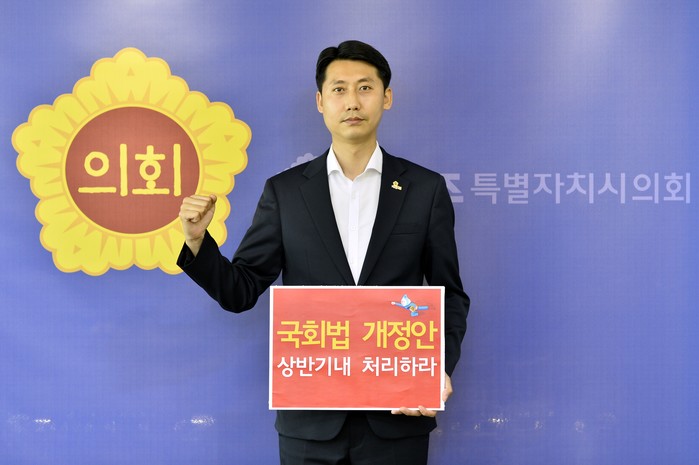 이날 이태환 의장은 ‘국회법 개정안 상반기 내 처리하라’고 적힌 손 팻말을 들고 촬영한 사진을 SNS에 게시했다.