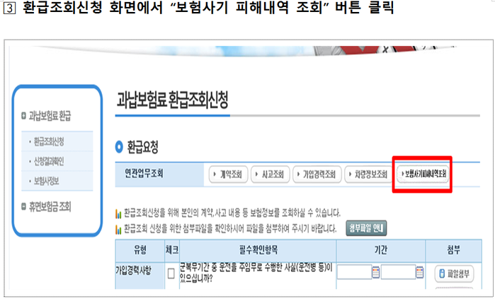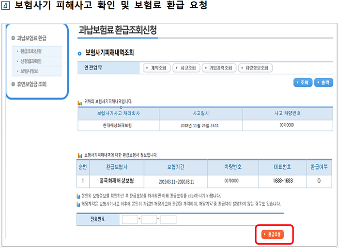 보험사기 피해자는 실제 사기가 의심되더라도 조사 후 판결 등으로 확정되기까지 상당 시일이 소요되어 피해사실 확인 및 권리구제 신청에 어려움이 있어 이에 신청인이 자동차 보험사기 피해정보를 직접 확인 후 보험료 환급을 요청할 수 있도록 ‘과납보험료 통합조회시스템’을 개선하여 보험개발원 자동차보험 과납보험료 통합조회 서비스에 직접 접속하거나 금융소비자 정보포털 파인에 접속하여 잠자는 내 돈 찾기 코너의 자동차보험 과납보험료 메뉴를 클릭하여 조회 가능하다.