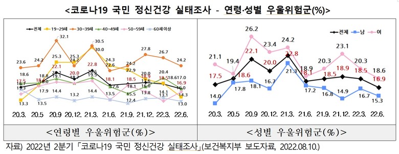 보건복지부가 발표한 2022년 2분기 “코로나19 국민 정신건강 실태조사”결과에 따르면, 우울위험군이 16.9%로 코로나 발생 이전인 2019년 3.2%의 5배가 넘고, 자살생각률은 12.7%로 2019년 4.6%과 비교하면 3배 가까이 높은 수준으로 나타났다.