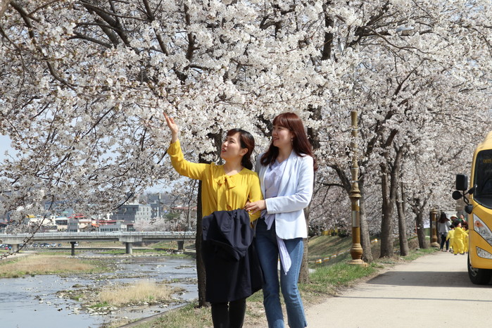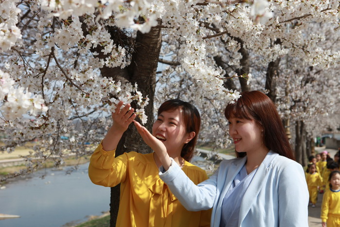 지역주민들과 어린이집 원아들이 봄나들이 장소로 영동천변 벚꽃길을 거닐며 봄의 낭만과 싱그러움을 즐기고 있다.