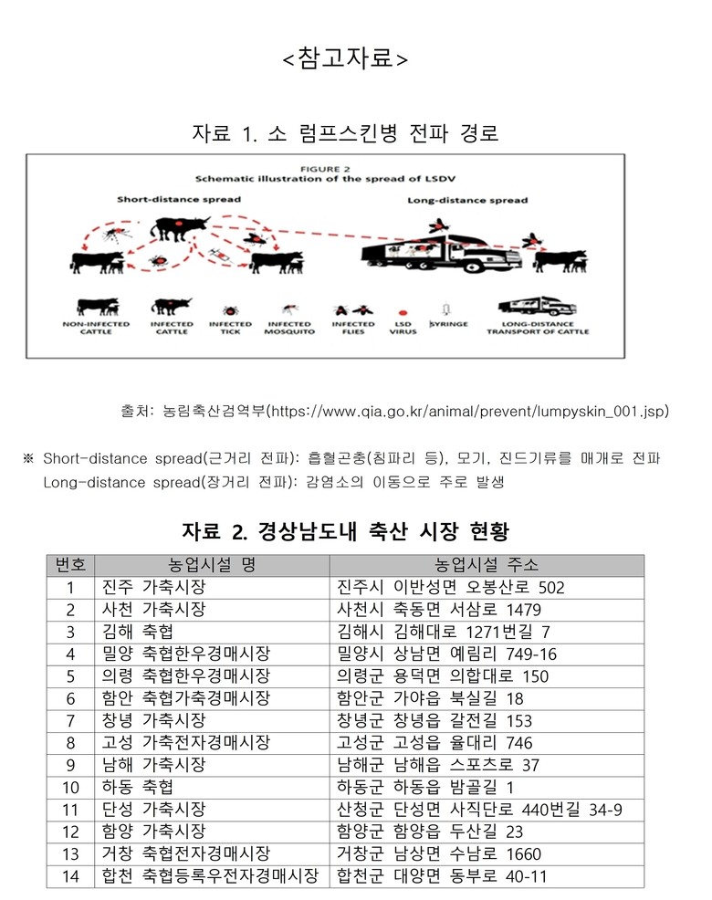지난 10월 20일 서산에서 첫 발병 이후 빠르게 확산하면서 정부는 위기 경보를 ‘심각’단계로 격상한 뒤 방역에 나섰다. 경남도도 도내 확산 방지에 총력을 기울여 증상 미발현 개체의 이동을 막기 위해 반입금지 조치를 취하는 한편, 진주시 이반성면 소재 가축시장을 포함 도내 14개소 가축시장을 폐쇄해 한·육우 거래 및 이동을 제한하고 있다. 그리고 확산 방지를 위해 긴급 백신접종과 함께, 흡혈곤충 등 방제를 위해 살충제를 배부하는 등 총력전을 펼치고 있다.