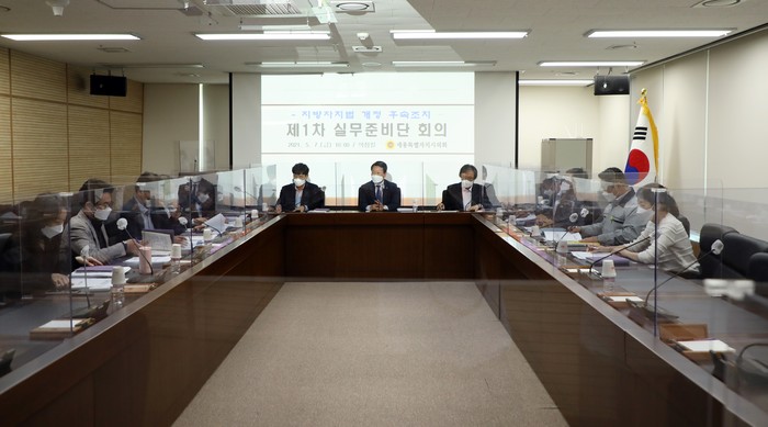 세종특별자치시의회(의장 이태환)는 7일 의정실에서 김덕중 사무처장을 중심으로 의정담당관, 의사입법담당관, 전문위원 등 3팀 9개 담당이 참석한 가운데 지방자치법 후속조치를 위한 실무준비단 첫 회의를 했다.