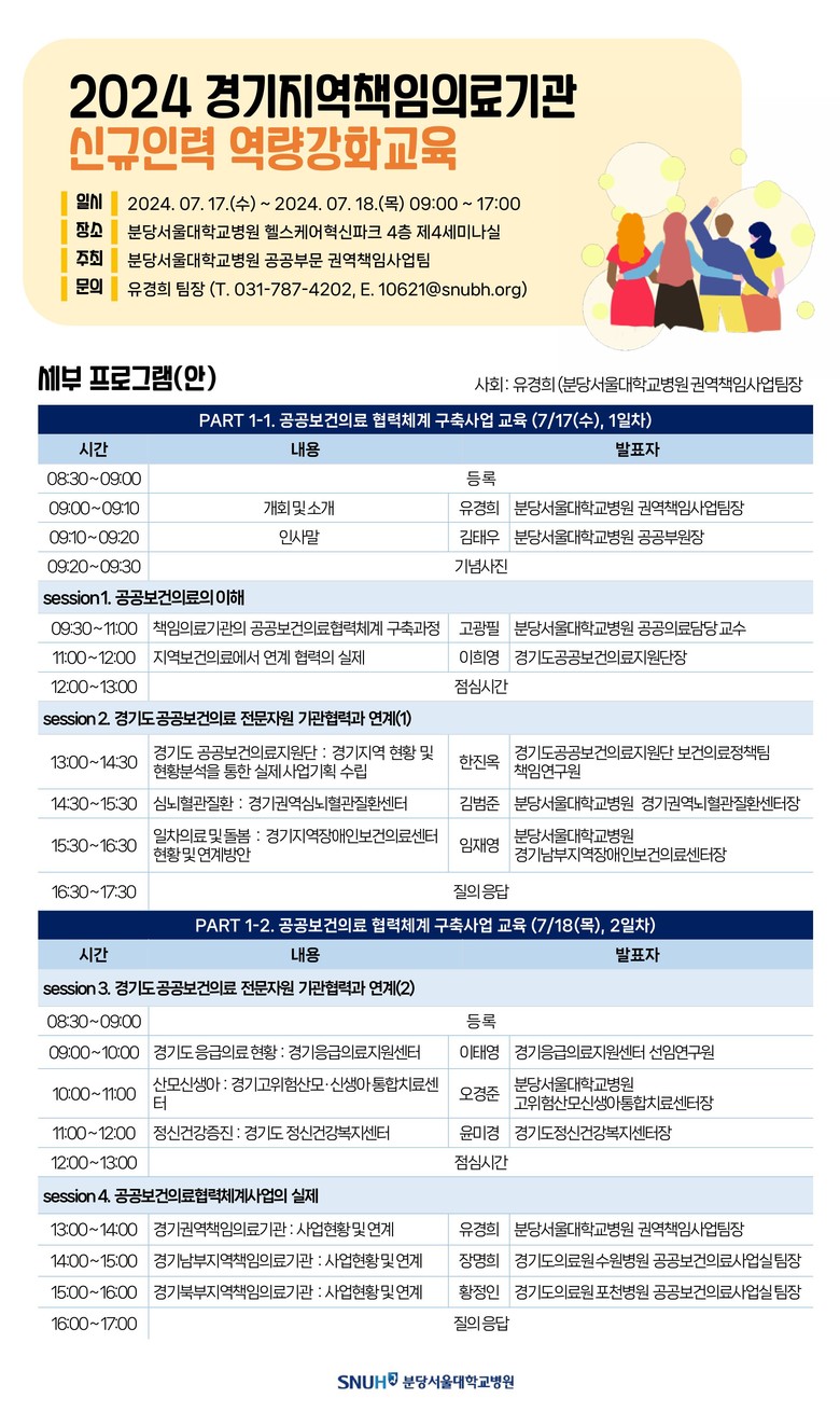 교육은 ▶공공보건의료의 이해 ▶경기도 공공보건의료 전문자원 기관의 협력과 연계 ▶공공보건의료 협력체계 사업의 실제 순으로 진행되며, 경기권역심뇌혈관질환센터, 고위험산모신생아통합치료센터, 경기남부지역장애인보건의료센터 등 실제 경기권역 의료 현장에서 이뤄지고 있는 다양한 공공의료 사업의 책임자들이 직접 협력 사업의 현황과 방향성 등을 소개할 예정이다.