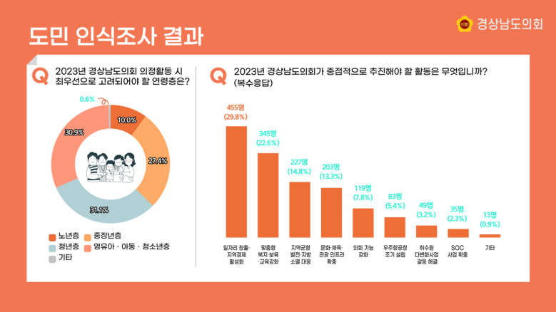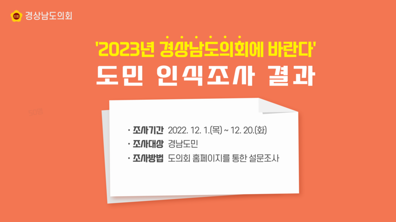 경상남도의회(의장 김진부)는 ‘2023년 경상남도의회에 바란다!’ 도민 인식조사를 지난 12월 1일부터 20일까지 실시하고 그 결과를 27일 발표했다.