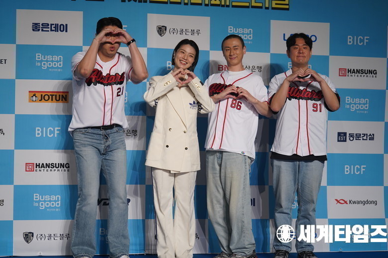 29일 부산 벡스코 오디토리움에서 제13회 부산국제코미디페스티벌(BICF) 개막식이 열린가운데 '안영미'와 서울코미디올스타스(송하빈, 김주환, 문지완) 팀이 블루카펫 행사에서 포즈를 취하고 있다.
