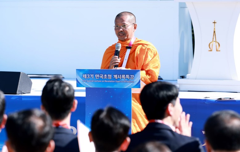 | ▲ 지난 1일 경기 청평 신천지 평화연수원에서 신천지예수교 증거장막성전 주최로 열린 ‘제3기 만국초청 계시록 특강 종강식’에서 속 분트은(국립불교 교육총감찰부 불교고등교육부) 국장이 사례를 발표하고 있다 [사진 제공 = 신천지예수교 증거장막성전] |