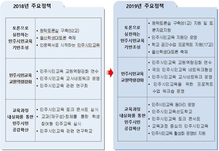 학생 대토론 축제, 학생 참여 예산제, 민주시민교육 토크 콘서트, 지원단 구성, 민주시민교육 교사 및 학생 동아리, 프로젝트 학습 지원, 교원 역량강화 연수 등을 추진할 예정입니다.*