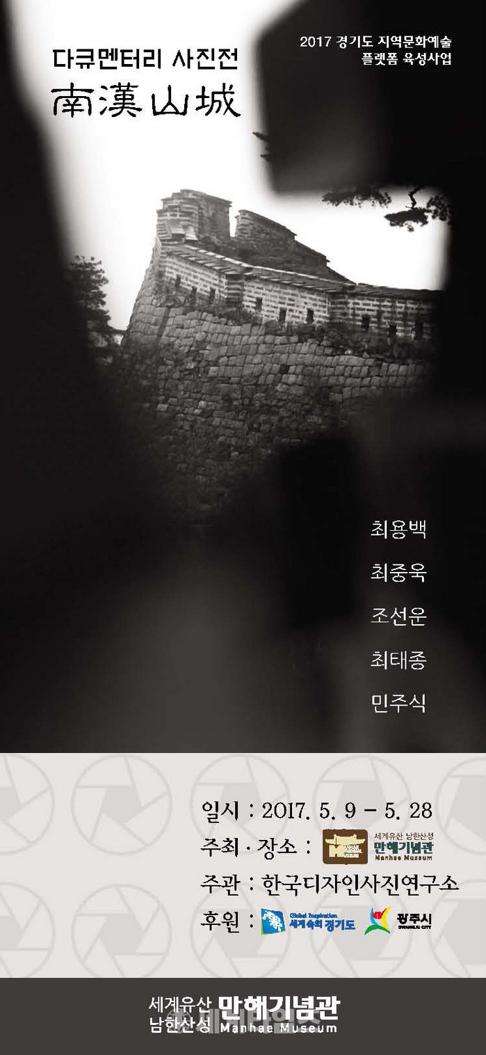 남한산성 만해기념관(명예관장:전보삼)은 5월 9일부터 5월 28일까지 주최 만해기념관, 주관 한국디자인사진연구소 5명의 사진작가 최용백,최중욱,조승미,최태종,민주식을 초대하여 <다큐멘터리 사진전 남한산성> 특별전을 남한산성 만해기념관 기획전시실 1층 갤러리에서 개최한다. 이번 전시는 2017 경기도 지역문화예술 플랫폼 육성사업으로 진행된다.