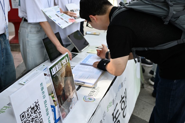 | ▲지난 7일 영등포역 부근에서 열린 동행 캠페인 홍보부스에서 시민에게 동행 캠페인에 대한 지지 메시지를 받고 있다. [사진 제공 = HWPL 글로벌 08지부] |