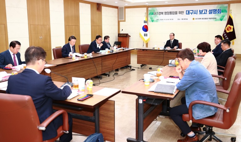 [대전 세계타임즈=한윤석 기자] 대구시의회 대구경북 행정통합 특별위원회(위원장 조경구)는 11월 6일(수) 시의회 3층 회의실에서 행정통합에 대한 설명회를 열었다. 이번 설명회는 대구시 관계 부서로부터 홍보 및 의견 수렴 현황을 보고받고, 행정통합에 대한 시민들의 공감대 형성과 주민 여론을 파악하는 자리였다.