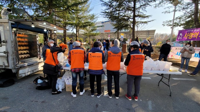 이날 봉사에는 신상일 단장을 비롯한 사랑의 사다리 밴드 10명과 ㈜동건운수 이선엽 대표, 지상욱 부장, 한우리 봉사단 20명이 함께 목상동 6곳의 경로당에 직접 배달을 하였다.