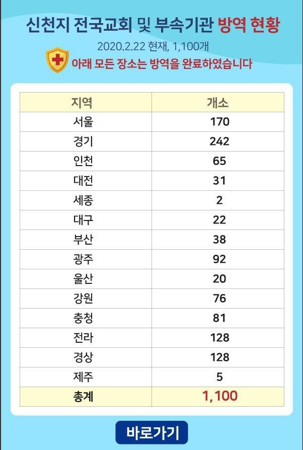신천지예수교회는 22일 홈페이지를 통해 전국 교회 및 부속기관 1천여 개에 대한 소독 방역 현황을 공개하고, 질병관리본부에 주소를 제공했다.