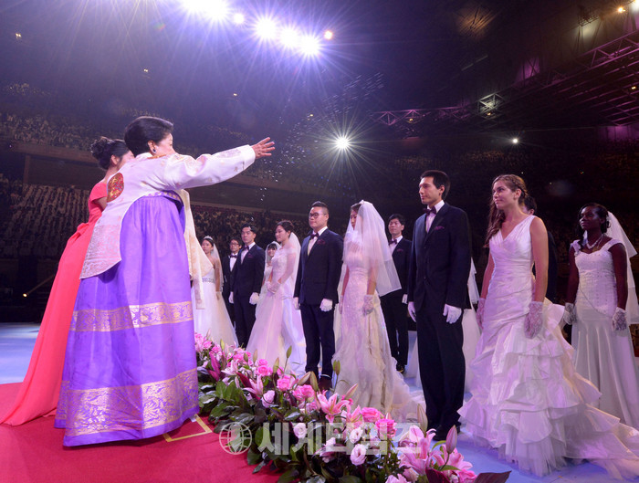 왼쪽은 성수 의식을 하는 한학자 총재. 이날 미국, 영국, 독일, 이탈리아, 일본, 호주, 싱가포르, 필리핀, 네팔, 러시아, 아르헨티나, 콜롬비아, 요르단, 수단, 남아프리카공화국 등 64개국 4000여쌍과 인터넷 생중계를 통해 194개국에서 동참한 2만여쌍 등 모두 2만 4000여쌍의 신랑신부가 동시에 식을 올렸다. 2017.09.07.