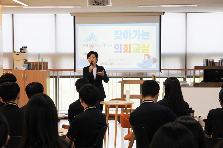 찾아가는 의회 교실은 세종시의회에서 운영하는 청소년 의회 교실 프로그램 중 하나다. 세종시의원이 직접 관내 학교를 방문하여 지방의회와 시의원의 역할을 알기 쉽게 설명하고 질의응답을 통해 친근한 소통의 시간을 가지는 프로그램이다.