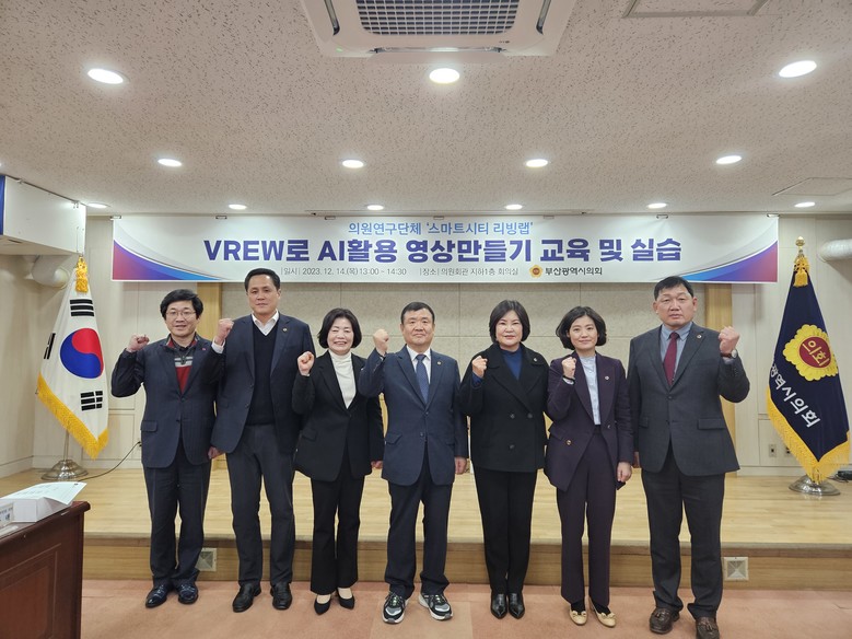 [부산 세계타임즈=이용우 기자] 부산광역시의회는 의원 연구단체 ‘스마트시티 리빙랩’이 지난 14일 ‘VREW로 AI활용 영상만들기’에 대한 교육 및 실습을 진행했다고 밝혔다.