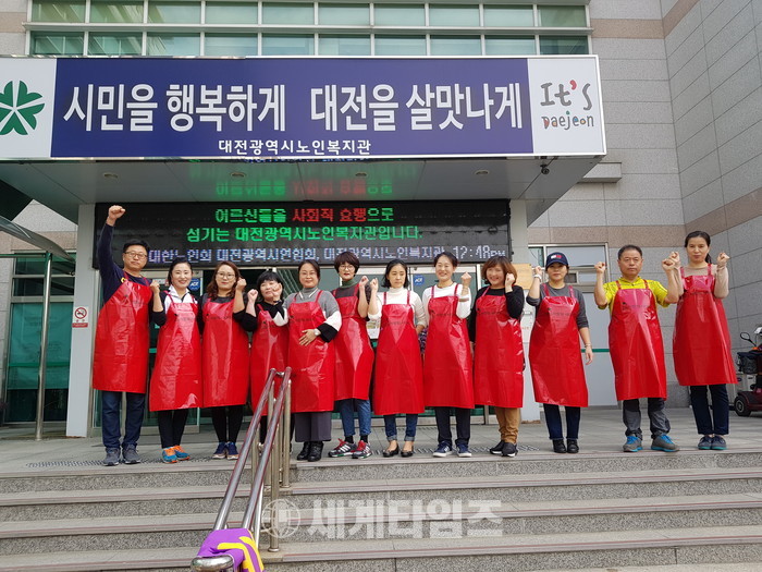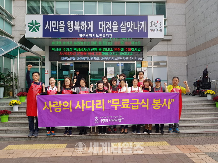[대전=세계타임즈 이장성 기자] 꾸준하고 다양한 봉사활동을 하고 있는 SNS 봉사단체 사랑의 사다리 밴드(리더 이정제)는 26일(목) 오전11시40분부터 대전광역시 노인복지관(관장 유한봉)에서 밴드회원 14명이 설거지 및 잔밥 처리 봉사로 사회적 효행을 실천하였다.