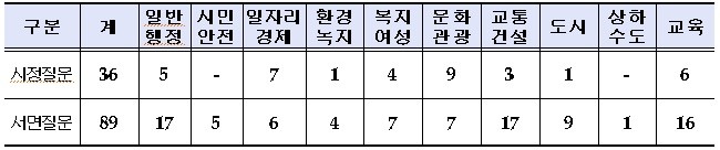 시정의 정책방향과 업무처리 내용, 각종 주요사업의 추진현황을 점검하고 정책적 대안을 제시하기 위해 시정질문 36건, 서면질문 89건을 통하여 교육.복지정책 및 지역경제, 행정의 투명성 확보와 효율성 제고 등 시정의 비판과 견제기능을 수행했다.