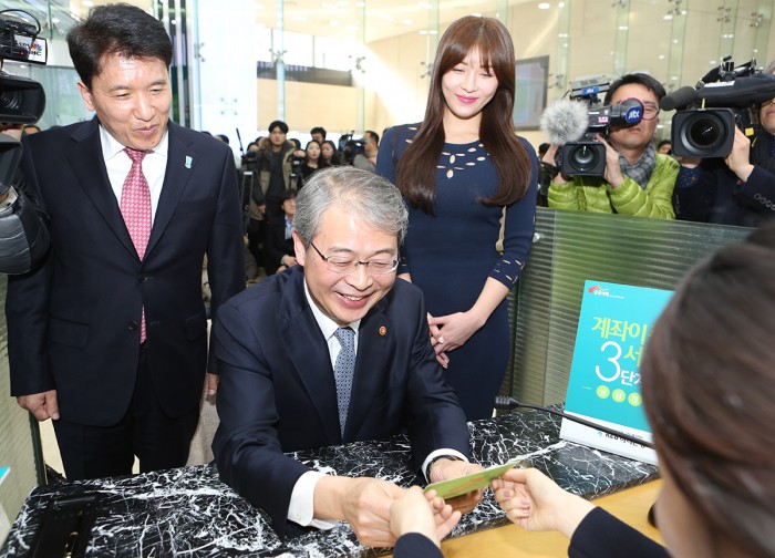 자동이체 처리 범위도 확대됐다. 기존 계좌이동 서비스를 받을 수 있었던 이체 내역에 워세나 동창회비 등 고객이 직접 이체 주기와 금액을 설정한 자동송금 이체 은행도 쉽게 바꿀 수 있게 된다.25일 서울 중구 을지로 KEB하나은행 본점 영업부에서 '계좌이동서비스 3단계 시행 기념행사'가 열렸다. 사진은 임종룡 금융위원장(가운데)과 함영주 KEB하나은행장(사진 왼쪽), 배우 하지원(사진 오른쪽)이 시연을 해보는 모습.<사진제공=KEB하나은행>