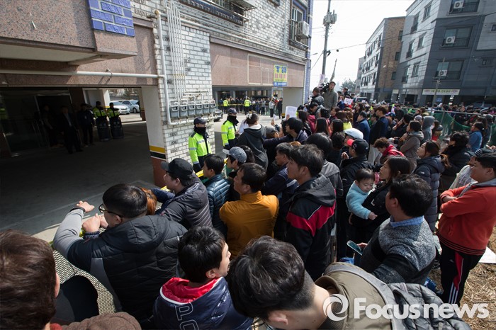 (평택=포커스뉴스) 학대와 무관심 속에 살해당한 신원영 군의 계모 김모 씨와 친부 신모 씨가 14일 오후 경기도 평택시 포승읍 자택에 도착하기를 시민단체 회원들과 시민들이 기다리고 있다.