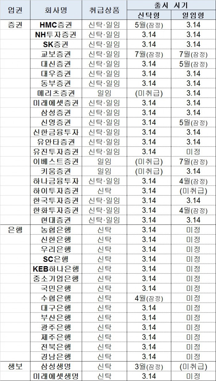 가입자 수면에선 은행이 앞섰지만 실상 ISA계좌에 들어온 금액은 증권사가 많다. 이는 증권사가 은행보다 발빠르게 신탁형·일임형ISA를 도입했기 때문이라는 게 업계의 분석이다. 현재 증권사는 신탁형과 일임형ISA를 모두 취급하고 있지만, 은행은 신탁형ISA만 가입자를 받고 있다.