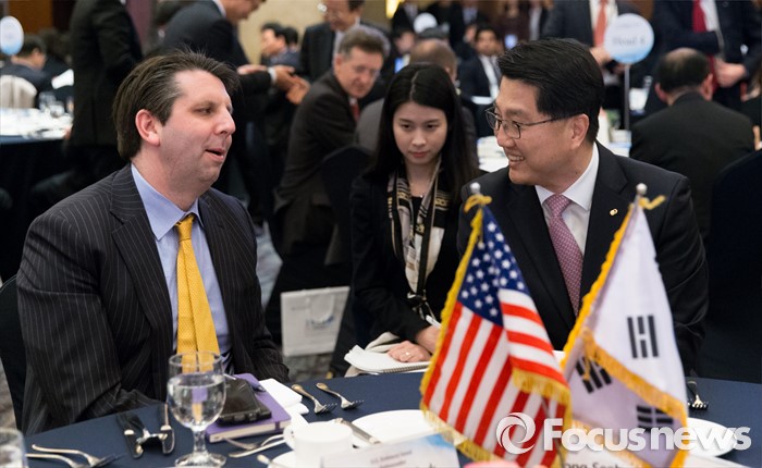 (서울=포커스뉴스) 22일 오전 서울 중구 소공로 롯데호텔에서 진웅섭(오른쪽) 금융감독원장과 마크 리퍼트 주한미국대사가 외국계금융회사 대상 업무설명회 'FSS SPEAKS 2016'에 참석해 대화하고 있다.