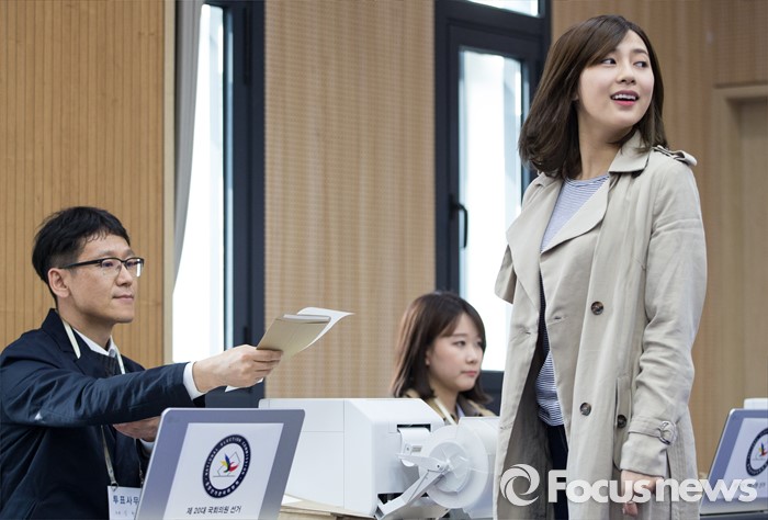 (서울=포커스뉴스) 에이핑크 오하영이 8일 오전 서울 마포구 서교동 주민센터에서 제 20대 총선 사전 투표를 하기위해 기표소에 방문하고 있다.