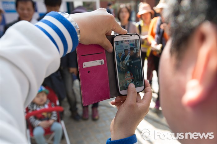 (서울=포커스뉴스) 11일 오후 서울 서대문구 청소년수련관 앞에서 영화배우 안내상, 우현씨가 우상호 더불어민주당 서대문구갑 후보를 지원하기 위해 시민들과 기념촬영을 하고 있다.