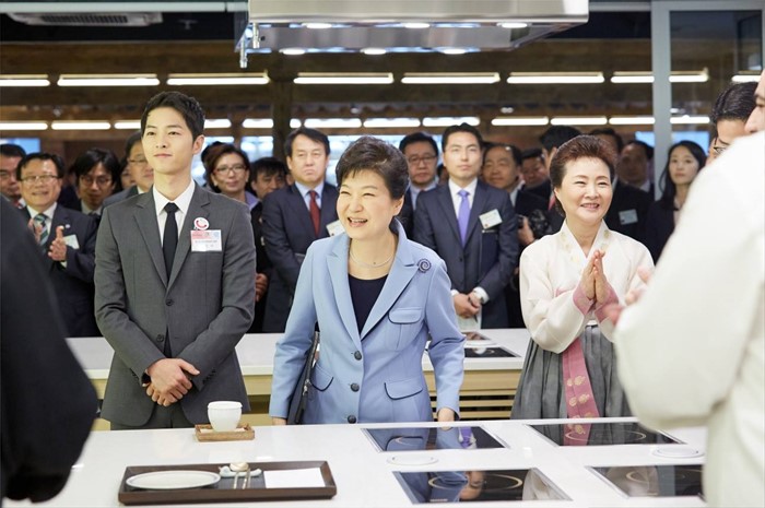 (서울=포커스뉴스) 박근혜 대통령은 11일 오전 서울 중구 한국관광공사 서울센터에서 열린 K-스타일 허브(K-Style Hub) 한식문화관 개소식에서 배우 송중기 및 윤숙자 한식재단 이사장 등과 함께 전시관들을 둘러보고 있다. <사진출처=청와대>