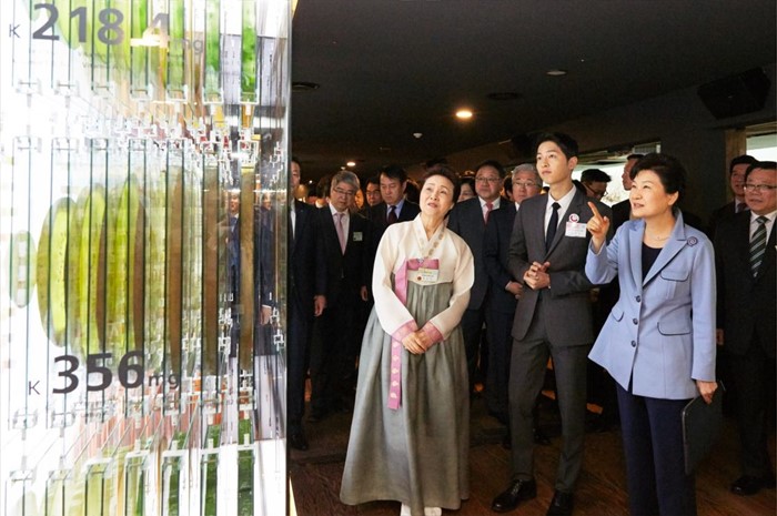 (서울=포커스뉴스) 박근혜 대통령은 11일 오전 서울 중구 한국관광공사 서울센터에서 열린 K-스타일 허브(K-Style Hub) 한식문화관 개소식에서 배우 송중기 및 윤숙자 한식재단 이사장 등과 함께 전시관들을 둘러보고 있다. <사진출처=청와대>