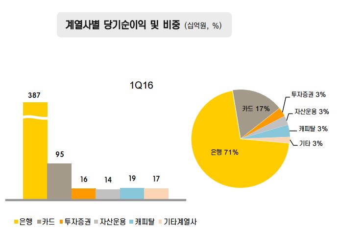 KB금융그룹은 작년 KB손해보험 자회사 편입으로 총자산이 대폭 증가했다. 총자산이 491조2000억원으로 신한금융지주(462조3105억·올해 1분기 기준), 하나금융지주(326억9000만·2015년말 기준)를 앞질렀다.