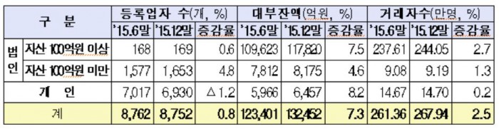 29일 금융위원회와 행정자치부, 금융감독원 등이 등록 대부업체 8752개를 대상으로 '2015년 하반기 대부업 실태조사'를 벌인 결과 대부업체는 평균 6.6%로 차입했으나 정작 서민에겐 평균 28%의 이자를 받아왔다.