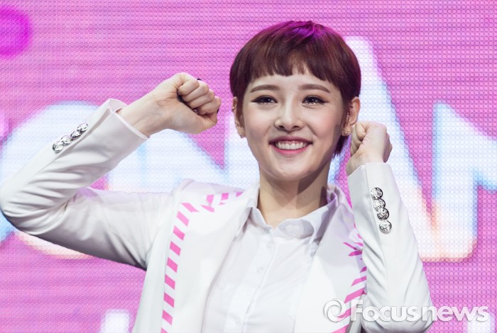 (서울=포커스뉴스) 29일 오전 서울 마포구 예스24 무브홀에서 열린 걸그룹 소나무의 미니앨범 '넘나 좋은 것' 쇼케이스에 참여한 멤버 뉴썬이 포토타임을 갖고 있다.