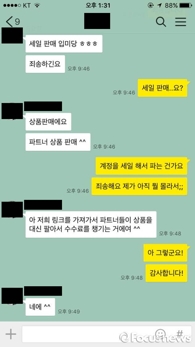 박 홍보총괄은 "이용자들은 신고가 별 게 아니라고 생각할 수도 있지만, 신고를 통해 접수된 내용은 수집돼 반드시 일괄 반영된다"며 "조금이라도 이상한 점을 발견하면 꼭 신고해달라"고 당부했다.'업체'로 추측되는 사람과의 대화. 거래자들을 '파트너'라 부르며 수수료를 챙겨준다고 한다.'이건희(신태일)'의 카톡 글. 계정을 살려주면 3000만원을 그 자리에서 주겠다는 말로 거래자들에게 제안을 하고 있다.