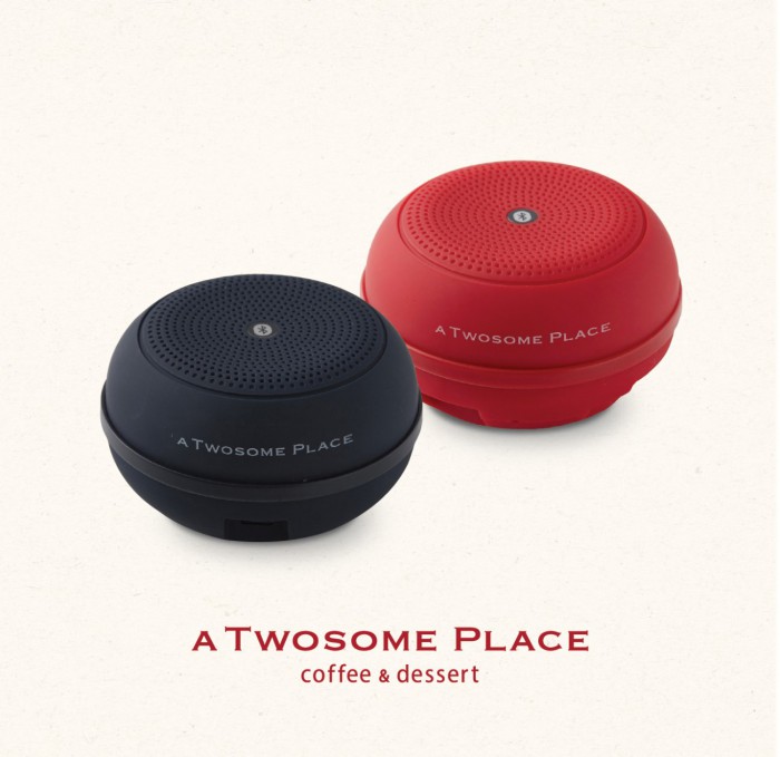 투썸플레이스의 블루투스 스피커는 작은 휴대용 타입으로 디저트 마카롱의 형태를 갖췄다. 색상은 레드와 네이비 2종으로 출시되며 스피커 케이스는 파우치로도 활용 가능하다.