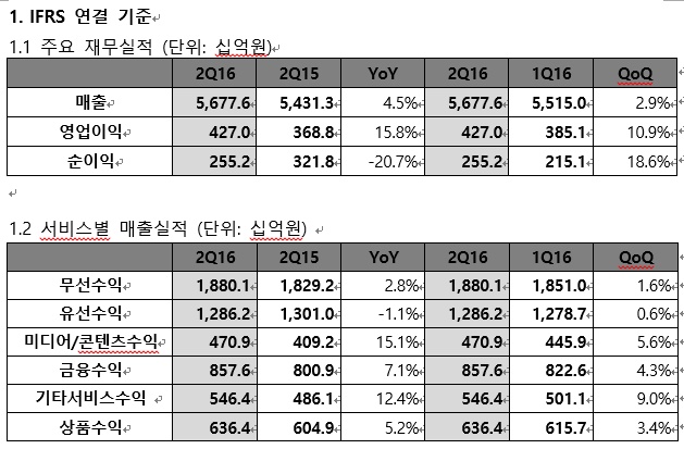 KT는 연결 기준으로 2016년 2분기 매출 5조6776억원, 영업이익 4270억을 기록했다고 29일 밝혔다. 무선, 미디어∙콘텐츠 분야의 성장이 지속된 가운데 기가 인터넷의 성장에 힘입어 유선 분야의 매출이 2분기 연속 반등에 성공해 매출은 전년 동기 대비 4.5%, 영업이익은 전년 동기 대비 15.8% 증가했다.