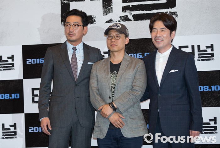 하정우는 무너진 ‘터널’ 속에서 역대급 연기를 선보인다. 그는 어둡고, 두렵고, 무서운 공간에서도 특유의 매력으로 관객의 웃음을 유발한다. ‘터널’의 메가폰은 ‘끝까지 간다’(2013년)를 통해 관객과 언론의 호평을 얻은 김성훈 감독이 잡았다. 하정우를 비롯해 오달수, 배두나 등이 열연한다. 이는 오는 10일 개봉해 관객과 만난다.'터널'의 메가폰을 잡은 김성훈 감독(왼쪽)이 배우 하정우를 극찬했다. 포커스뉴스DB.(서울=포커스뉴스) 3일 오후 서울 강남구 메가박스 코엑스점에서 열린 영화 '터널' 언론시사회에 참석한 배우 하정우(왼쪽부터), 김성훈 감독, 오달수가 포토타임을 갖고 있다. 2016.08.03 김유근 기자