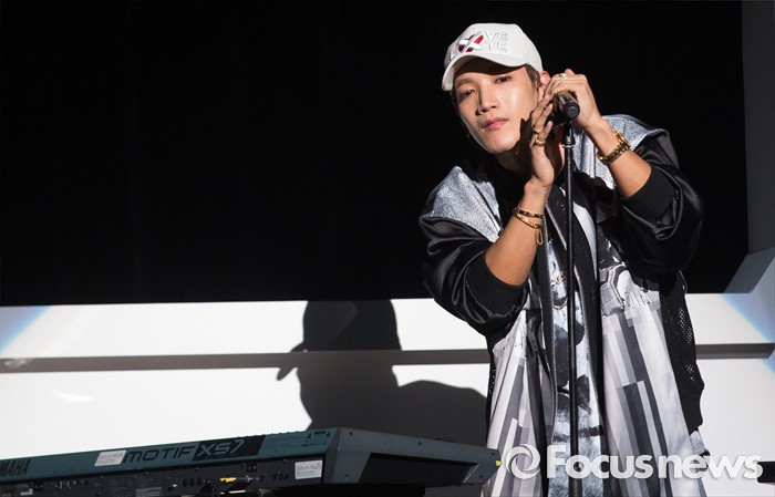 (서울=포커스뉴스) 8일 오후 서울 광진구 예스24 라이브홀에서 가수 준케이가 첫 솔로 미니앨범 쇼케이스를 열고 무대를 선보이고 있다.
