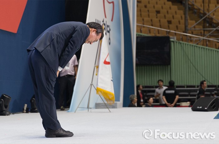 (서울=포커스뉴스) 9일 오후 서울 송파구 잠실실내체육관에서 열린 제4차 새누리당 전당대회에서 당대표로 선출된 이정현이 수락연설에 앞서 인사를 하고 있다.