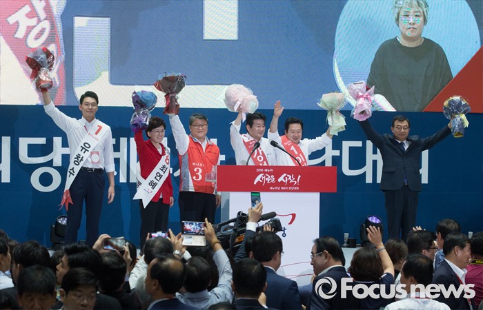 (서울=포커스뉴스) 9일 오후 서울 송파구 잠실실내체육관에서 열린 새누리당 4차 전당대회에서 당대표로 선출된 이정현 의원과 신임 최고위원들이 인사하고 있다. 왼쪽부터 유창수, 최연혜, 조원진, 강석호, 이장우 신임 최고위원, 이정현 신임 대표.
