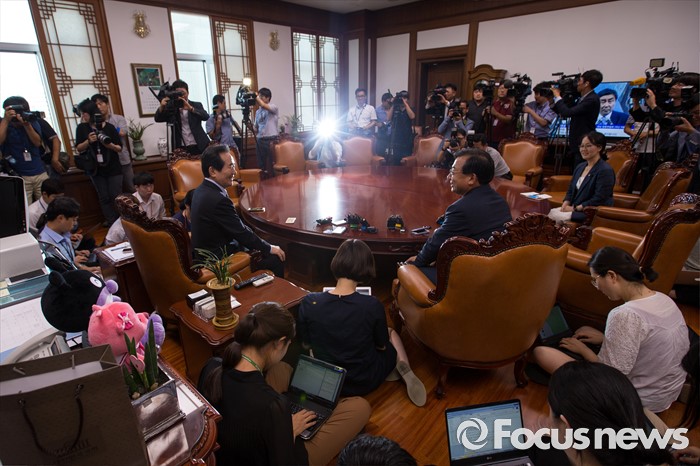 (서울=포커스뉴스) 이정현(오른쪽) 새누리당 대표가 11일 오후 서울 여의도 국회에서 정세균 국회의장을 예방 하고 있다.