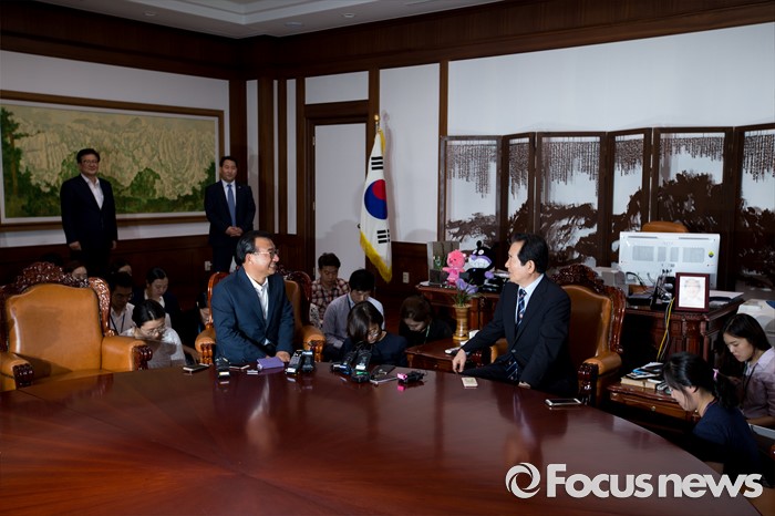 (서울=포커스뉴스) 이정현(왼쪽) 새누리당 대표가 11일 오후 서울 여의도 국회에서 정세균 국회의장을 예방 하고 있다.