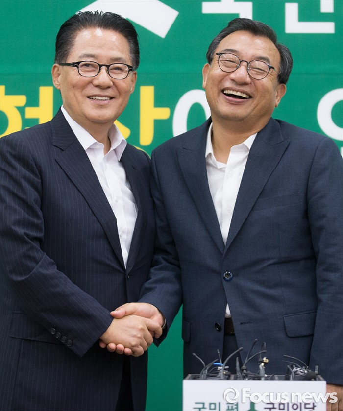 (서울=포커스뉴스) 11일 오후 서울 여의도 국회에서 박지원(왼쪽) 국민의당 비상대책위원장이 이정현 새누리당 대표와 면담에 앞서 인사하고 있다.