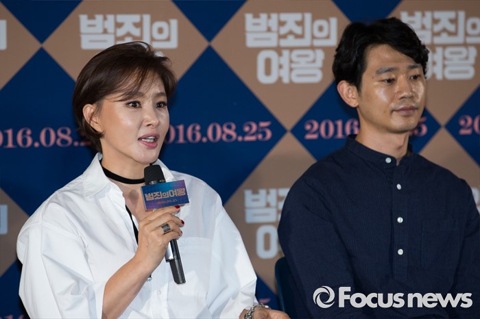 (서울=포커스뉴스) 11일 오후 서울 성동구 CGV 왕십리에서 열린 영화 '범죄의 여왕' 언론시사회에 참석한 배우 박지영(왼쪽)이 취재진 질문에 답변하고 있다. 오른쪽은 배우 김대현.