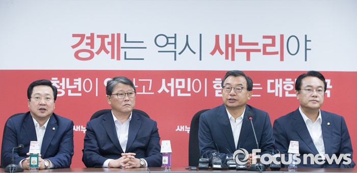 (서울=포커스뉴스) 11일 오후 서울 여의도 국회에서 열린 전기세 누진제 개편 긴급 당정 협의에 참석한 이정현 새누리당 대표가 모두발언을 하고 있다. 왼쪽부터 이장우, 조원진 최고위원, 이 대표, 정진석 원내대표.
